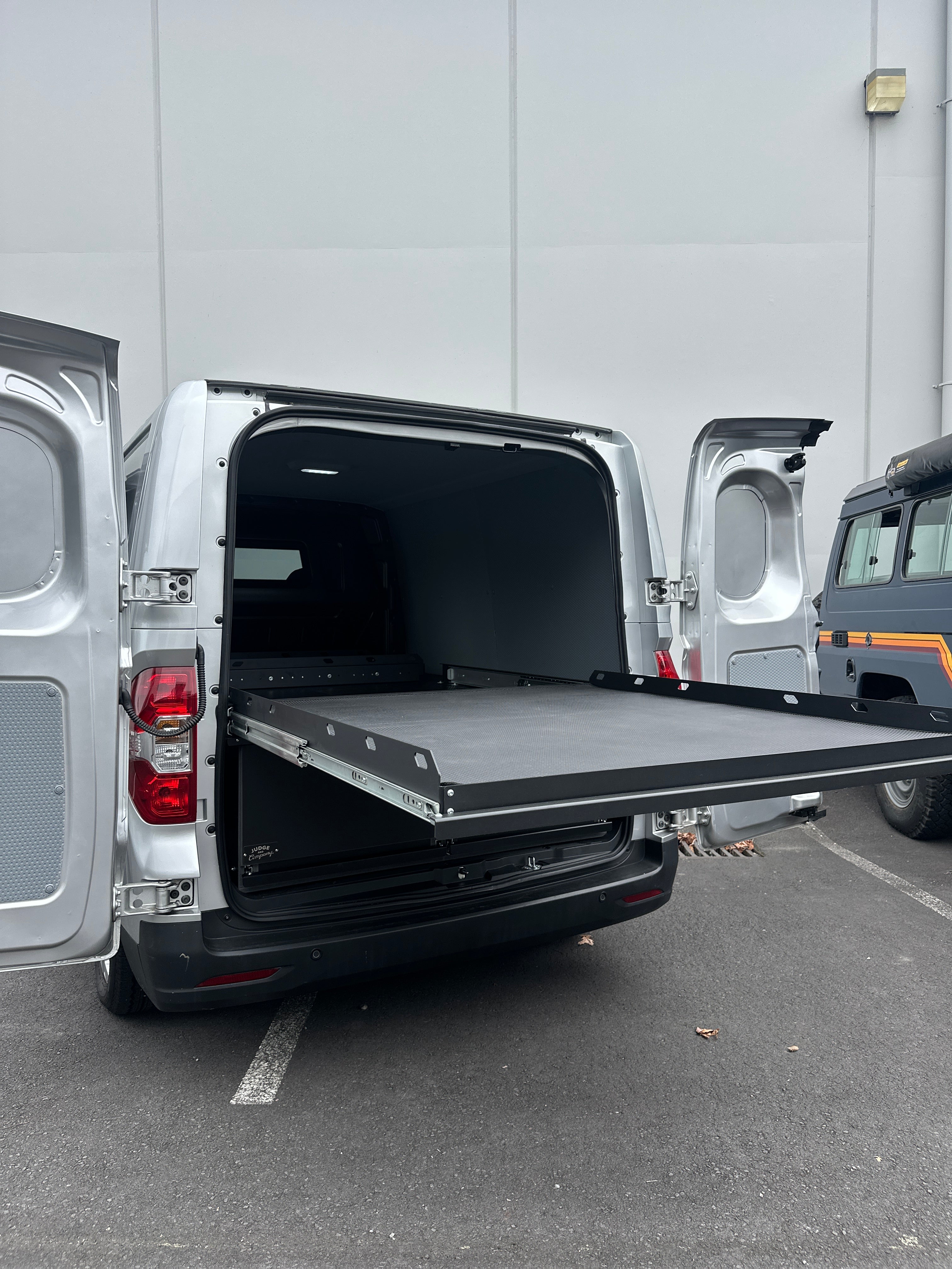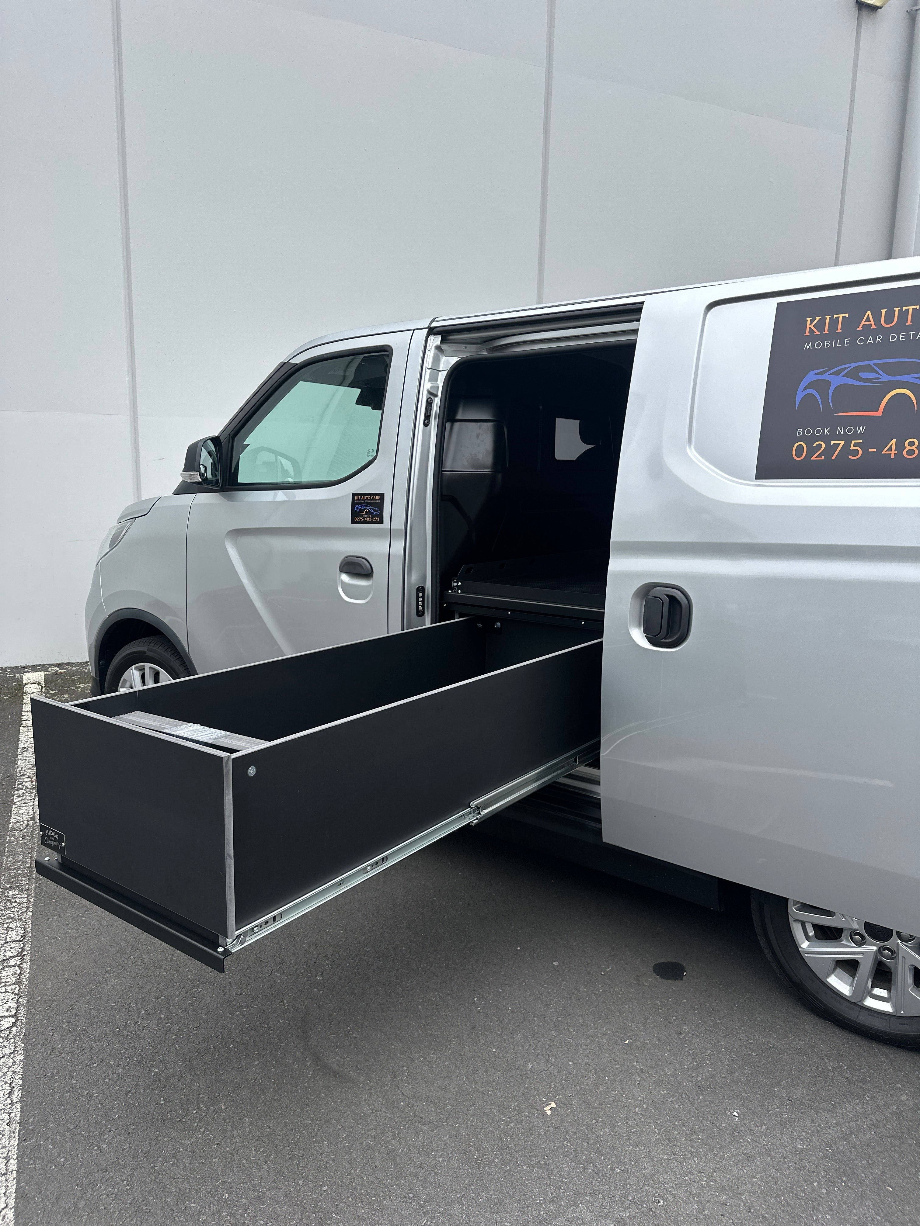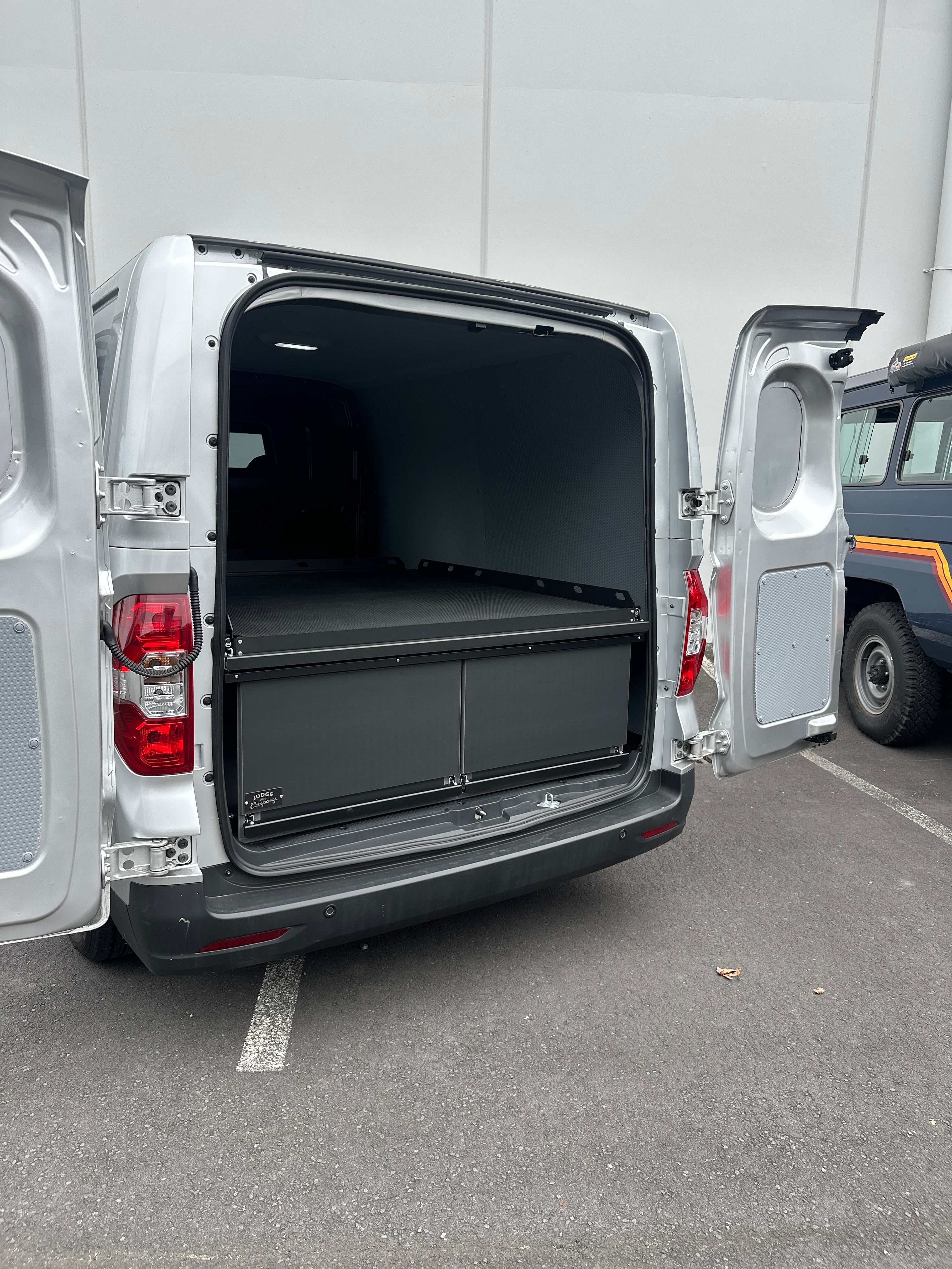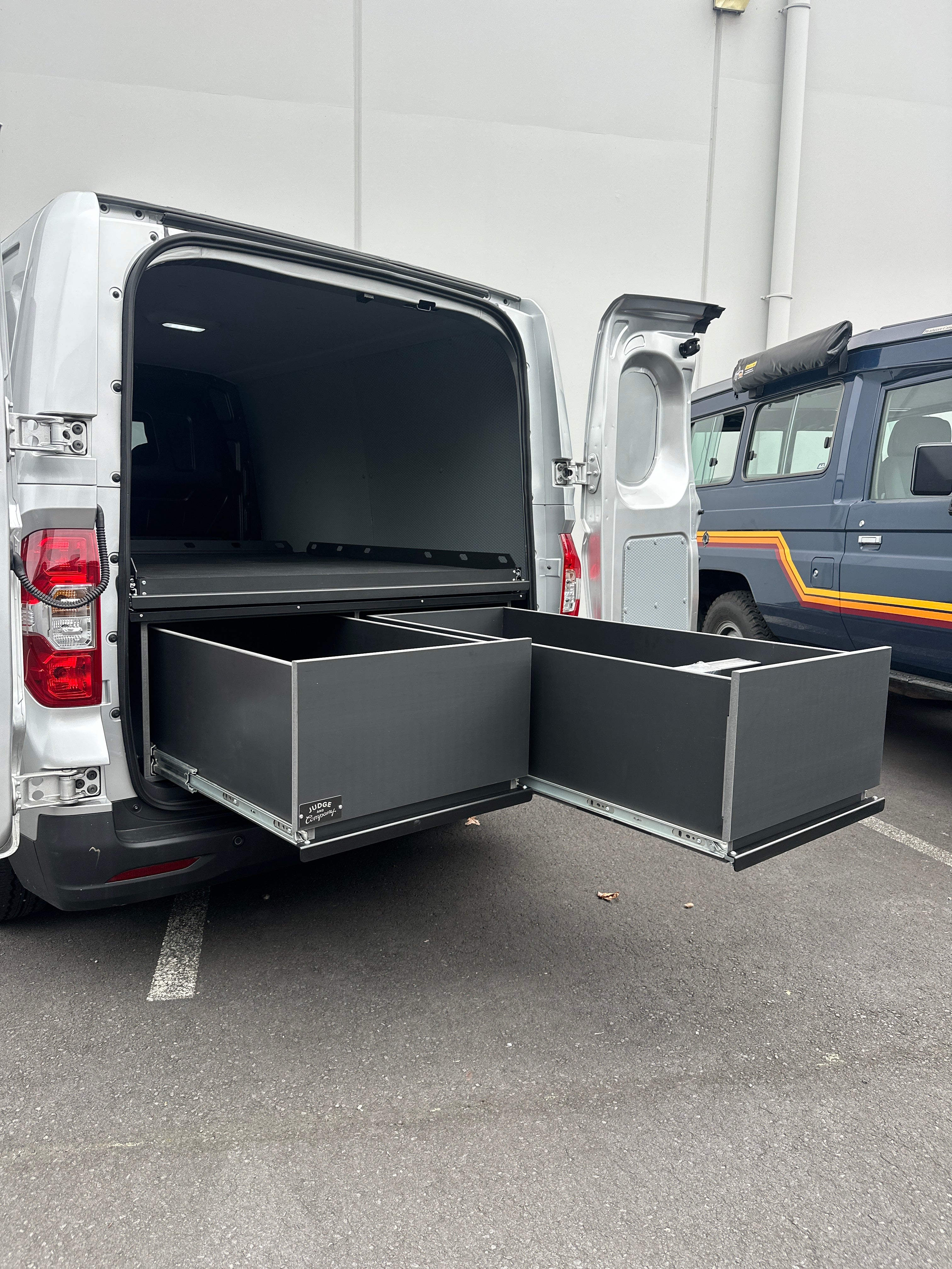 On vans with a single side door, the system uses two long drawers extending from that door to maximise the available space.