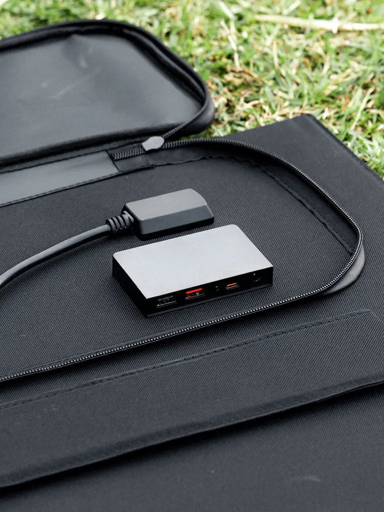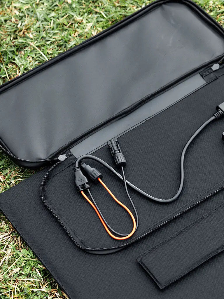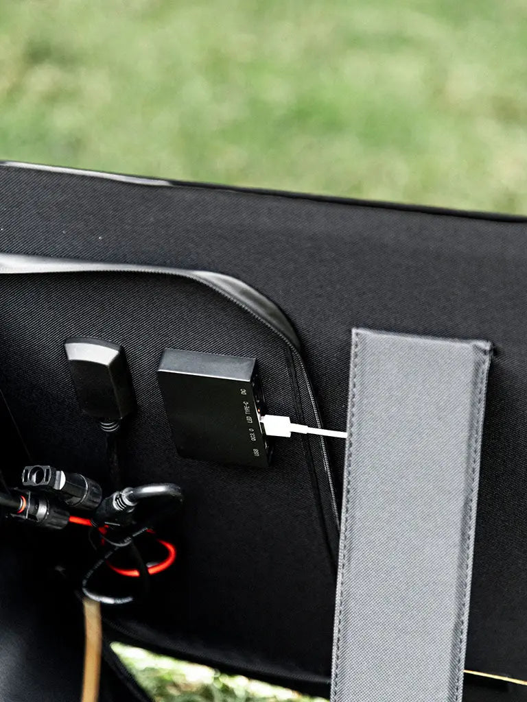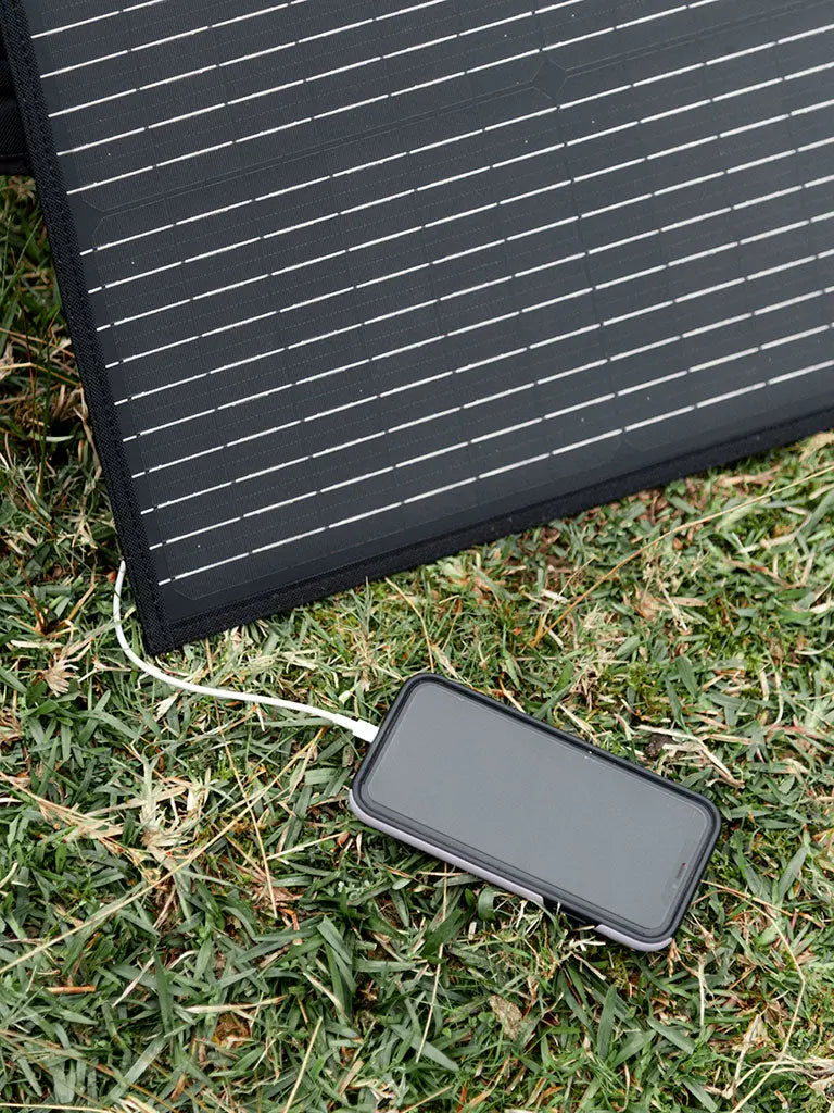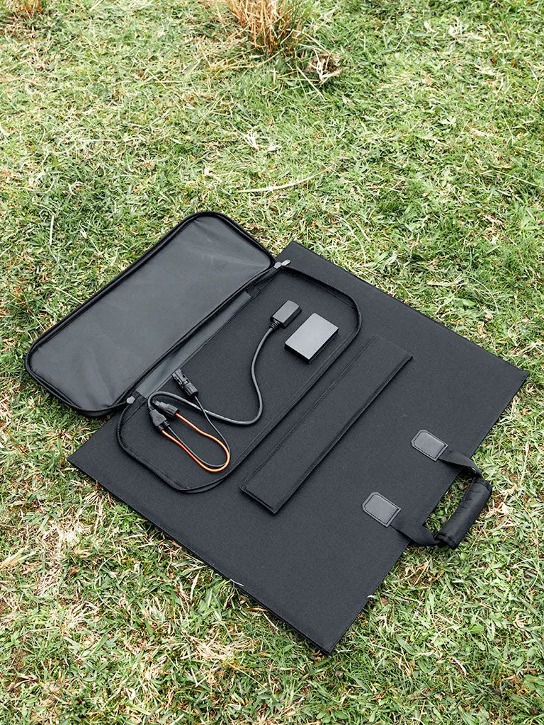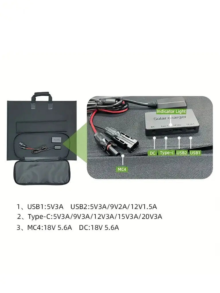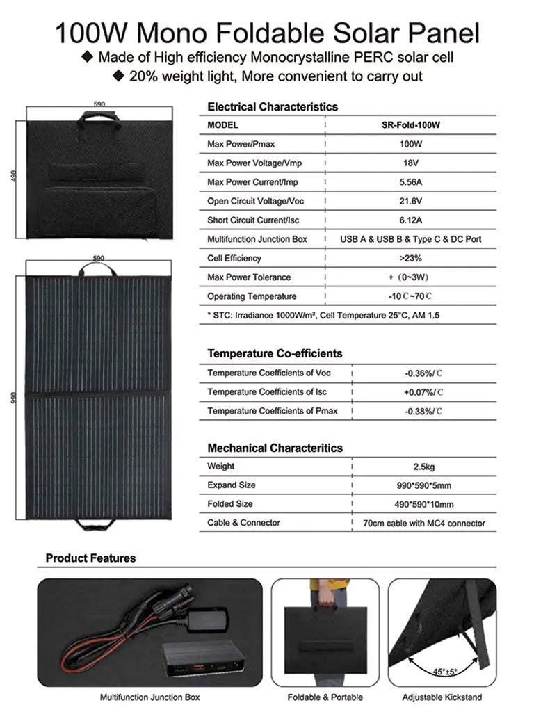 Our 12V 100W Folding Solar Panel is both convenient and portable, making it the ideal power solution. It features an entire solar power system in one compact package, utilizing the most efficient monocrystalline solar cells available. Weighing only 3kgs, it includes two 50 Watt Monocrystalline Solar Panels, a 5.56 Amp PWM solar Charge Controller with LED indicators, Mc4 solar connectors and a heavy duty bag for safe portability. With a carrying handle, fold out legs, it is the perfect portable kit for all your solar needs. Great to add as additional solar input on cloudy days or run 2 or more together. includes DC/Type-c/MC4 dual USB fast charging.