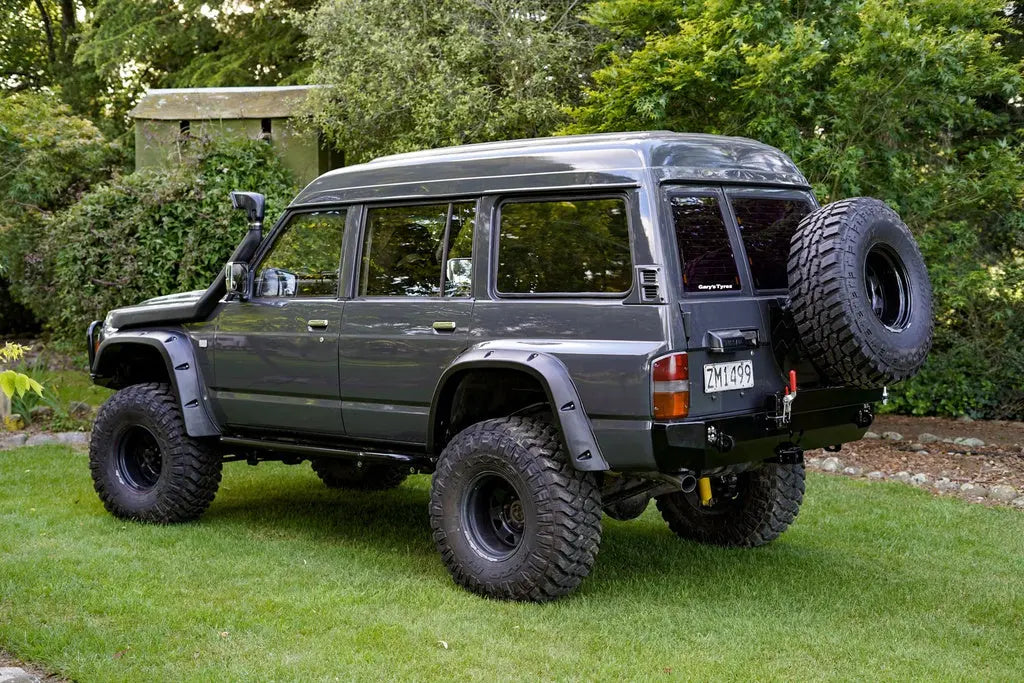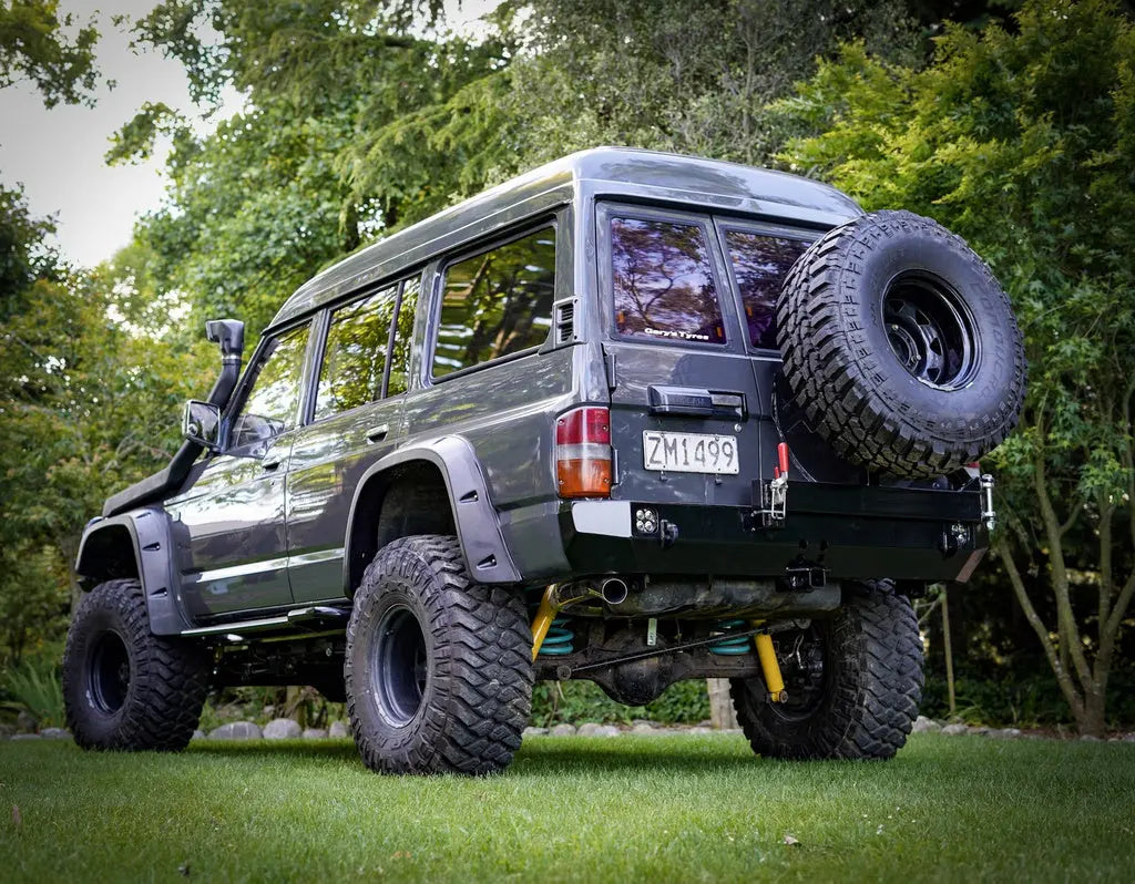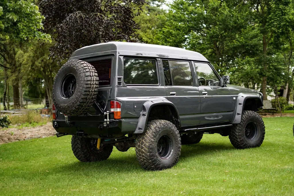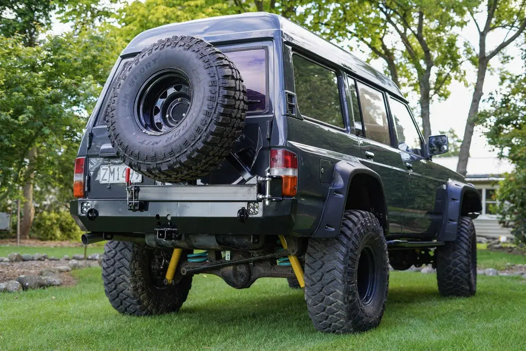 When we set out to design this rear bar, we wanted to create something that packed as much functionality as possible while still looking great and complementing the lines of the iconic Nissan GQ Patrol. The low profile wrap-around design and optional side hoops will take your GQ Patrol's offroad performance to new levels. The sloping rear profile and optional recessed hitch receiver further increase clearance and provide a smooth surface to slide over obstacles. These features make a very noticeable difference during deep ditch crossing and steep obstacle climbs where other aftermarket bumpers with bulky rear profiles will hang up and impede progress on the trail. Simply put, this bumper allows you to forget about departure angle and substantially improves the offroad capability of your GQ Patrol.The main section of this bumper is CNC-bent out of a single piece of 3/16″ (5mm) P&O Steel. This greatly reduces the amount of welding and grinding required by you and makes for a cleaner finished product. If you are paying to have the bumper assembled by a welding shop, this significantly lowers the cost.We realize that at the age they are now at, many GQ Patrol's can have frames that are rusty or otherwise damaged in some way. For this reason, we went completely overkill with the mounting system for this bumper. It includes 5 mounting points per side for a total of 10 mounting points! These mounting points use factory holes in the frame and are distributed over the full width of the frame. While this is overkill, it ensures the impact and pulling forces are distributed evenly over the vehicle frame. This also results in bumper corners that are properly supported and worthy of real offroad abuse.Unlike many aftermarket bumpers that are more or less empty shells with minimal reinforcement, this bumper contains extensive internal ribbing and mounts to the rear and sides of the vehicle frame for unmatched strength and stiffness. The bumper corners tie directly into the vehicle frame using these internal ribs, meaning they can take serious offroad hits without flexing into the vehicle body. With this bumper, you'll be able to tackle challenging trails with a new level of confidence knowing that the rear end of your GQ Patrol is now nearly invincible!The low-profile design of this bumper keeps the weight extremely reasonable at 60.2 lbs (27.4 kg) in steel and 29.5 lbs (13.4 kg) in aluminum while maintaining excellent strength. This is especially noteworthy when you consider the fact that the factory hitch receiver, rear bumper and recovery points all get removed before installing the Coastal Offroad bumper. This means that even with our steel bumper version, the total weight increase to your vehicle is negligible at best. This minimizes added stress on your vehicle, maintains precious payload capacity, and allows you to keep your factory suspension if desired.We finished this bumper off with integrated light buckets for surface mount LED pod lights (custom light cut outs available by request), a recessed hitch receiver, and heavy duty 9/16" (15mm) recovery points that are placed directly in line with the vehicle frame to eliminate any leveraging effects. These recovery points are formed by laser cut steel plates that pass through the bumper shell and bolt directly to the GQ Patrol's frame as part of the bumper's main mounting brackets. The recovery points then get welded to the in and outside of the bumper shell. These factors all combine to form recovery points that minimize stress on your GQ Patrol's frame and provide reliable recoveries of heavily loaded vehicles in the worst of offroad situations.The swing out tire carrier comes in either a single or dual sided configuration and is built to accept a tire up to 37" in diameter! Both carriers include mounting brackets for a hilift jack and other recovery items. The dual swing out includes the hilift mount as well as a lockable jerry can holder designed to fit two 20L NATO style jerry cans. These carriers feature heavy duty chromoly heim joint hinges, 2000lb toggle latches, T-handle spring pins, and a replaceable UHMW catch pad that provides secure, rattle free operation. The heim joints in conjunction with the toggle latch provide tons of adjustability, allowing for easy assembly and guaranteed alignment of the carrier latch. The single swing out add-on weighs 34lbs and the dual swing out add-on with gas can holder weighs 77lbs.