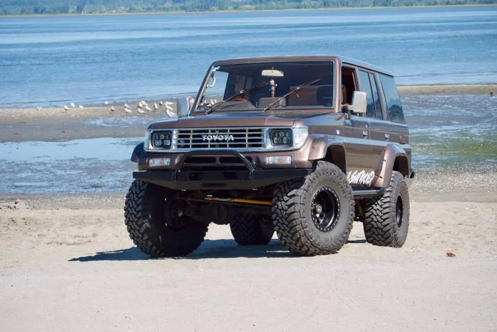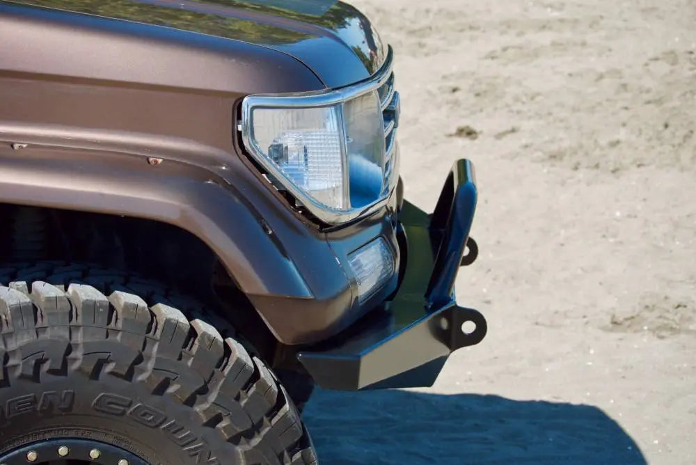 The profile of this bumper has been designed with maximum ground clearance and approach angles put first. The bumper sits as high and tight to the front of the 70 Series Toyota Land Cruiser as possible, while the angled lower faces will smoothly slide over obstacles and ensure you do not get hung up on the trail. The side wings of this bumper wrap around to the front wheel wells and tie directly into the main frame mounting plates for true offroad protection. These side wings will take a serious hit without flexing or deflecting into the vehicle body. We know that most Land Cruiser owners want to run oversized tires and more aggressive wheel offsets. This can create interference issues with the stock front bumper. We have thought ahead and specifically designed these bumper side wings to easily clear 35" tires.