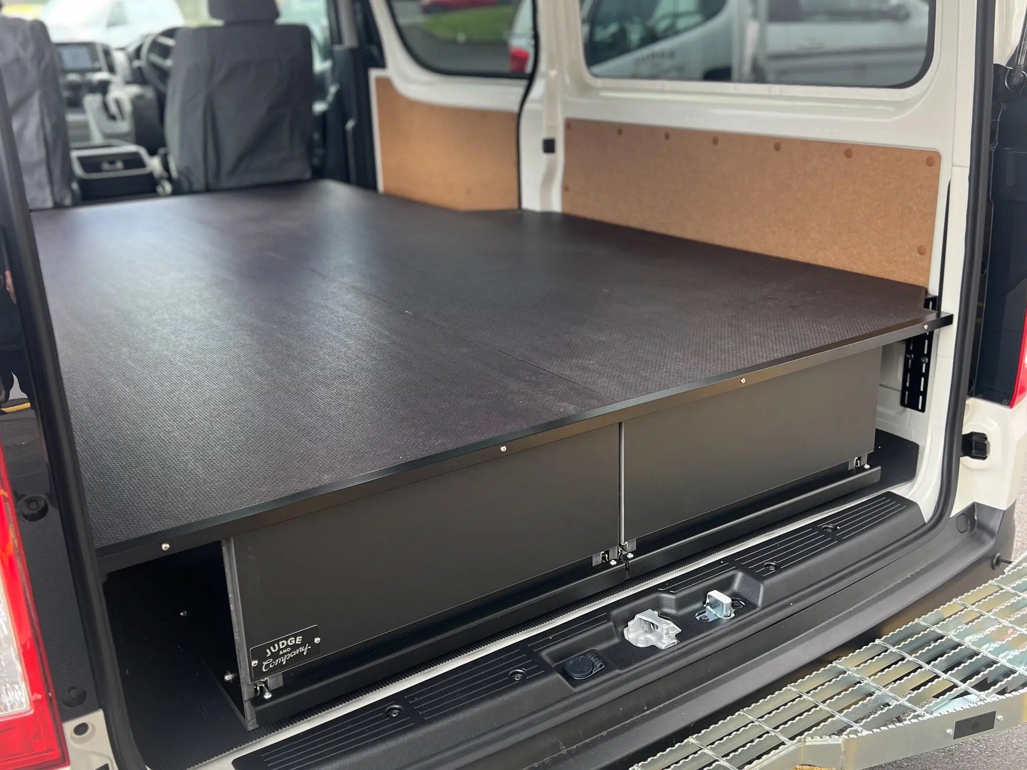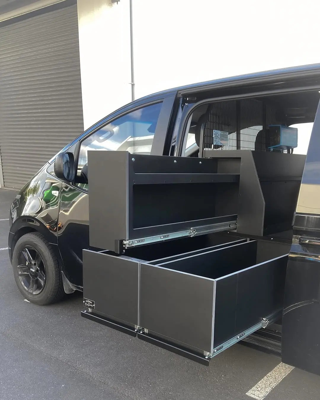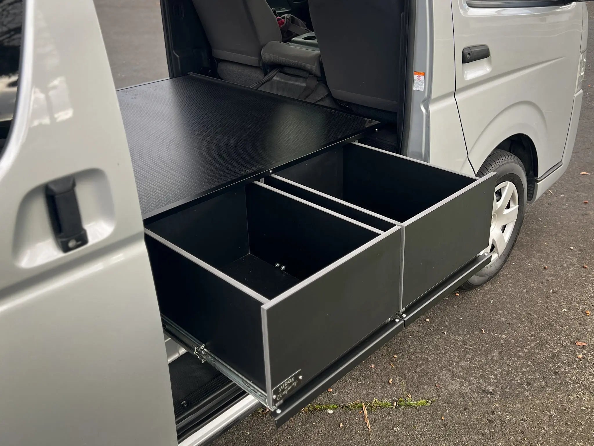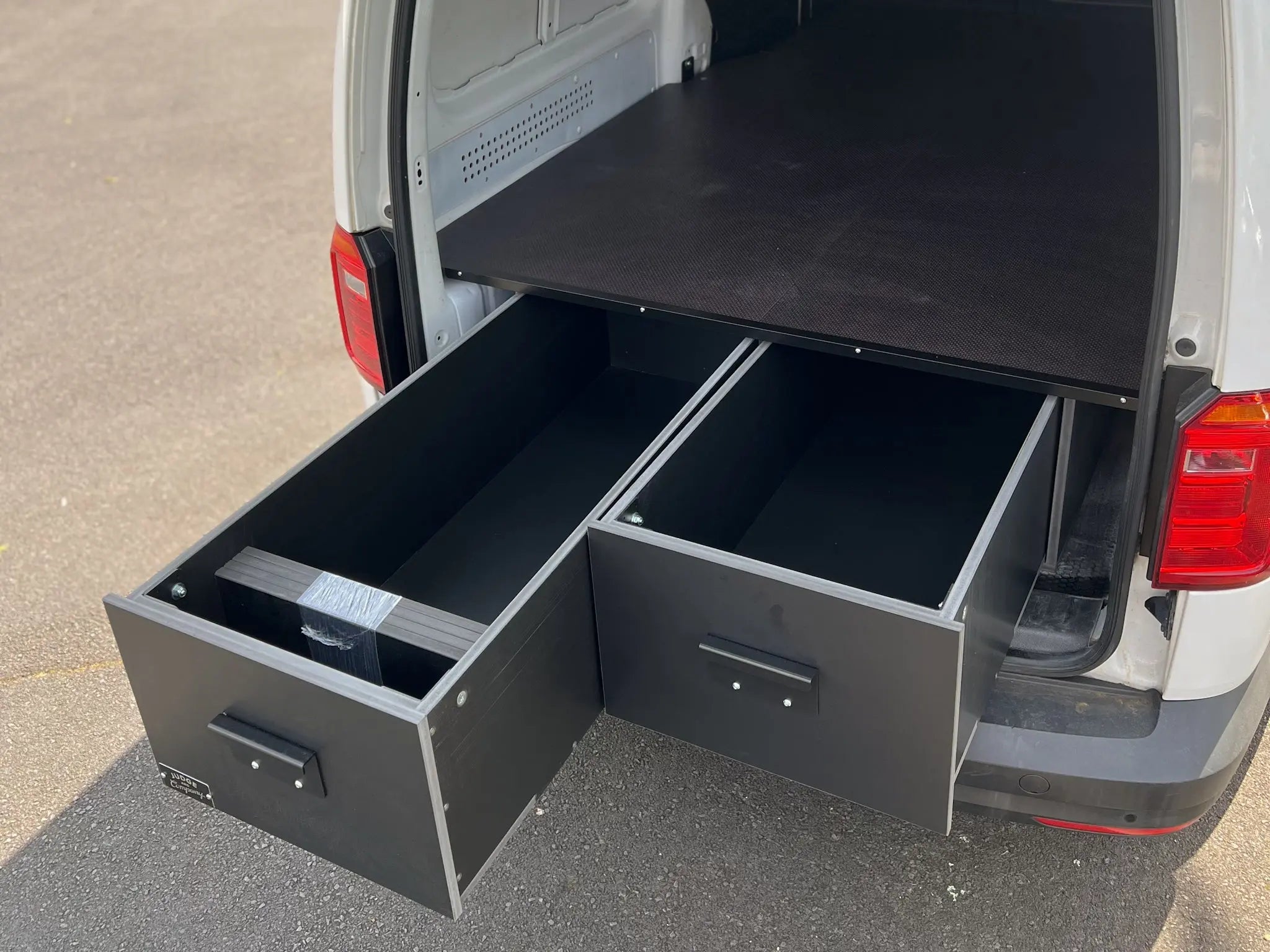 On vans with a single side door, the system uses two long drawers extending from that door to maximise the available space.