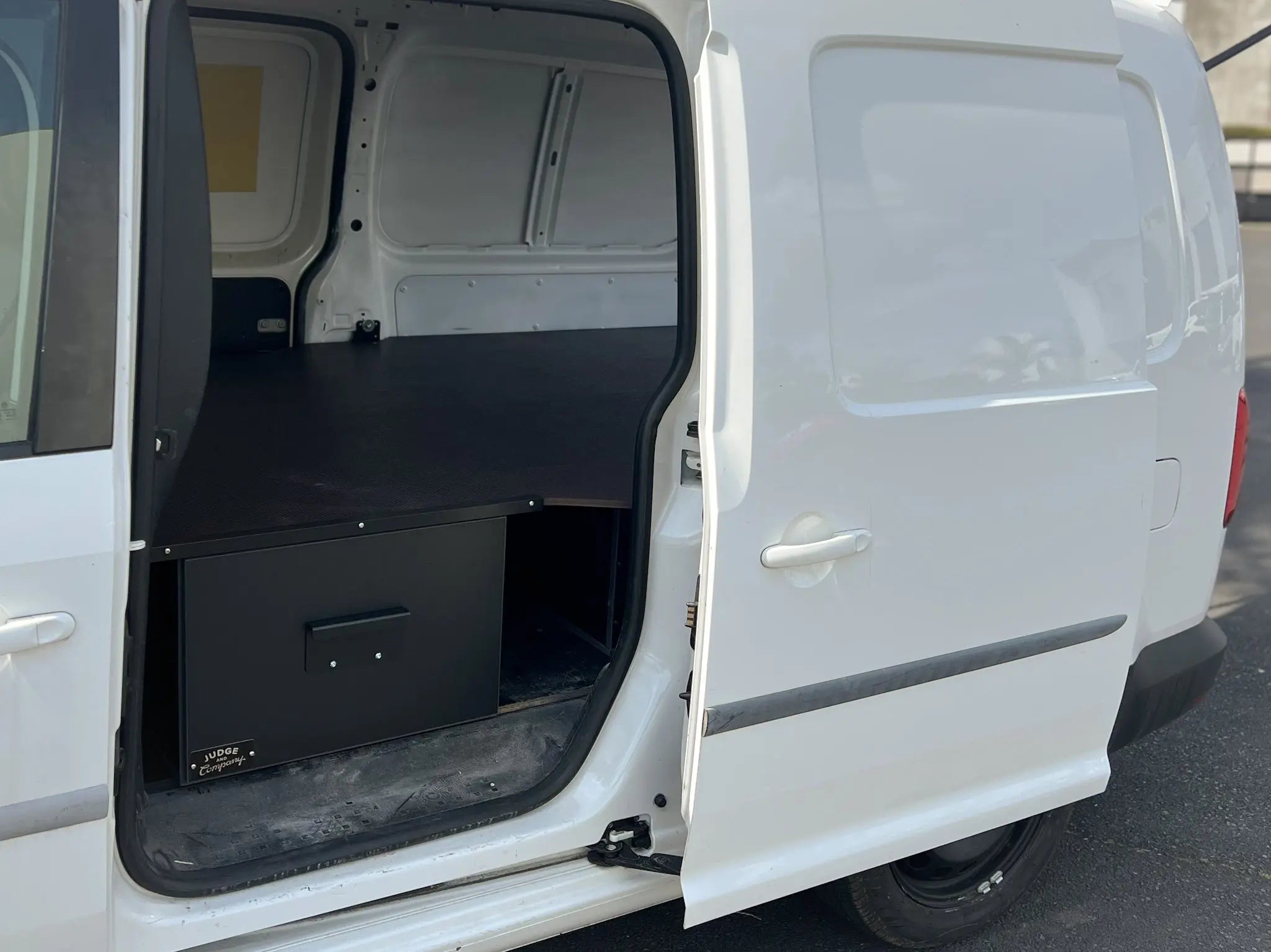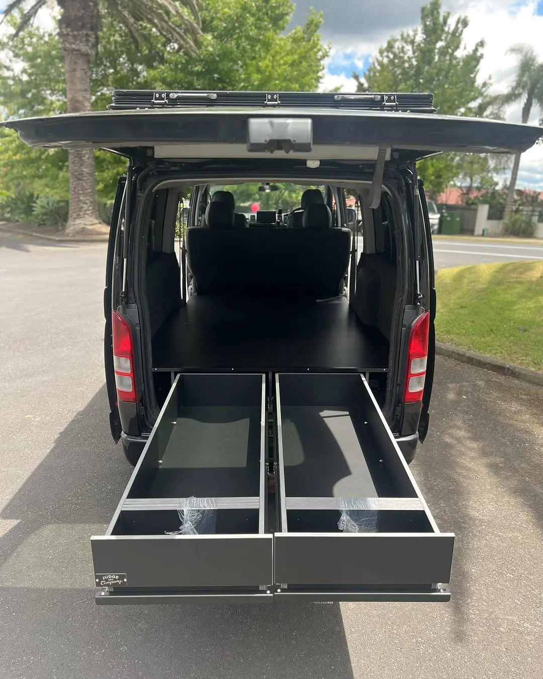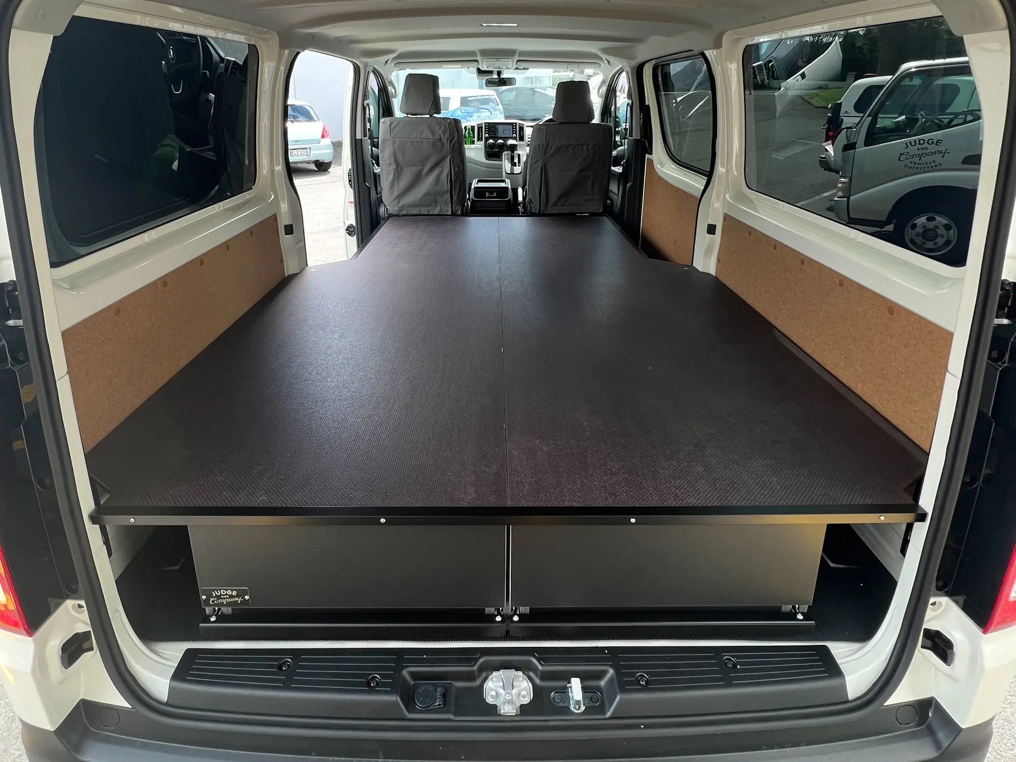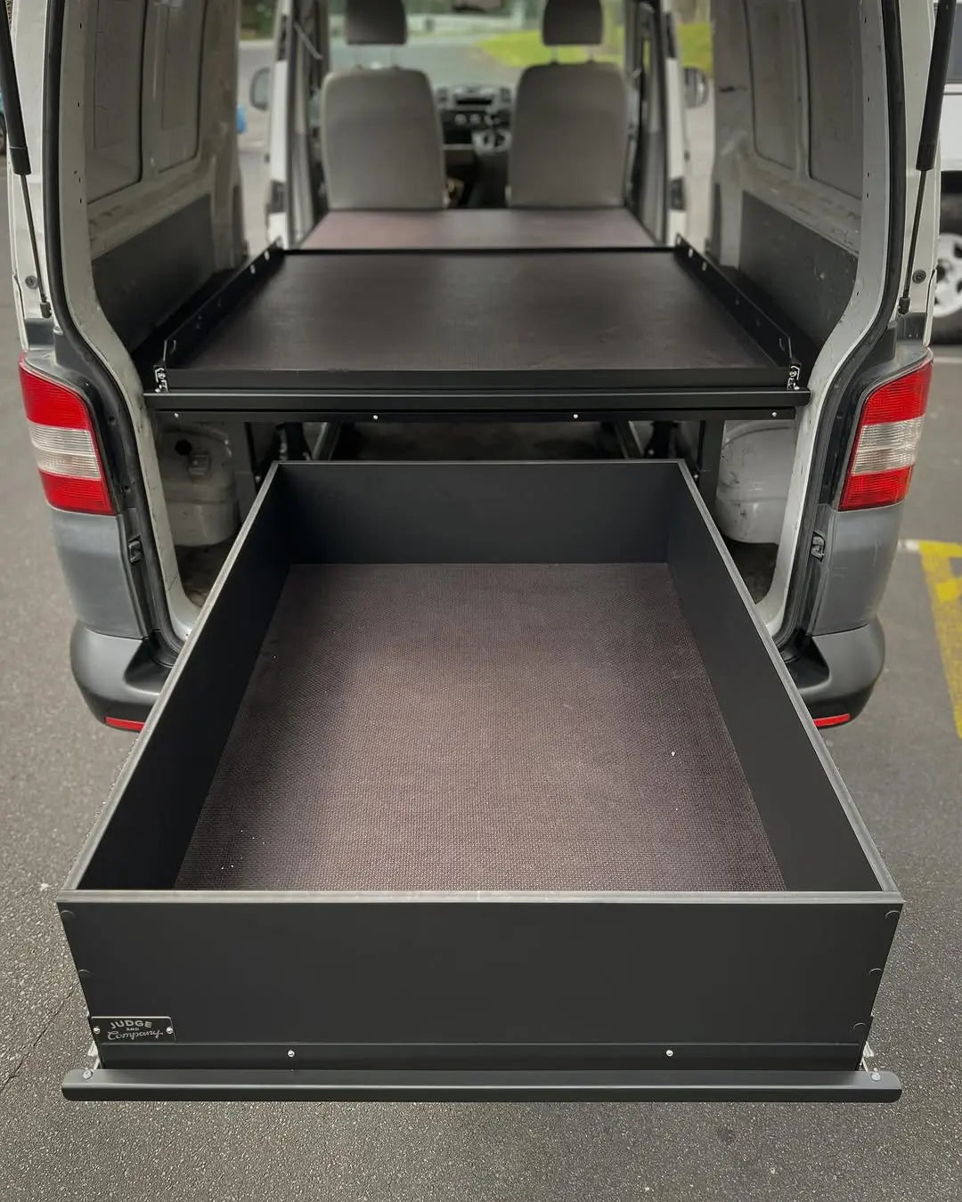 On vans with a single side door, the system uses two long drawers extending from that door to maximise the available space.